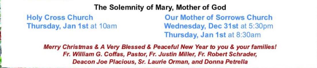 Thanks for checking in! This page lists activities at both Our Mother of Sorrow and Holy Cross Parishes! …