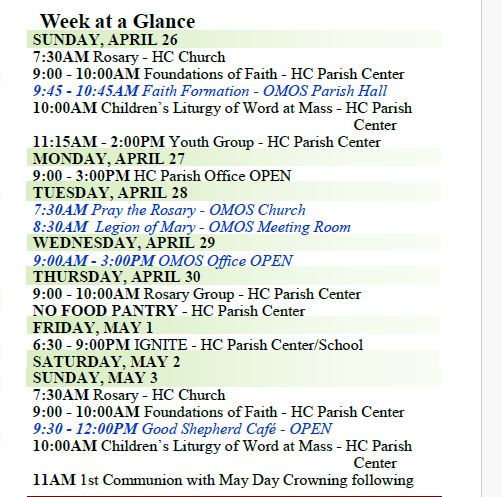 | 20 | 21 | 22OMOS Pray the RosaryOMOS Pray the RosaryTime: 7:30 am - 8:30 am OMOS Church Legion of Mary MeetingLegion of Mary MeetingTime: 8:30 am - 9:30 am OMOS Meeting Room for Legion of Mary | 23 | 24 | 25 | 26 | |||