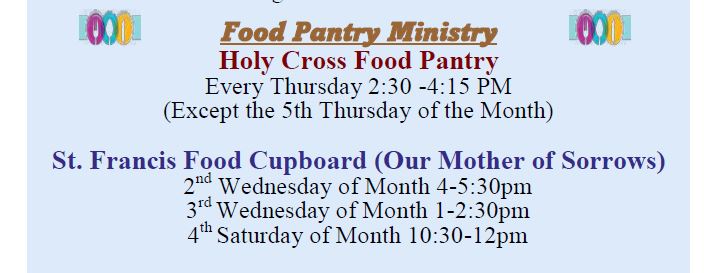 Please note that Identification and Proof of Residency in the Charlotte Area is necessary to access the Holy Cross Food Pantry.