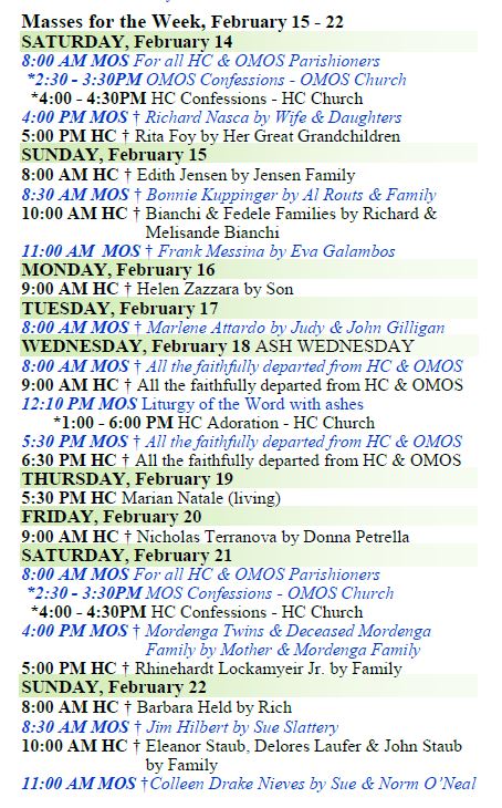 OUR MOTHER OF SORROWS AND HOLY CROSS SCHEDULE FOR THIS UPCOMING WEEK (FEBRUARY 15th TO FEBRUARY 22nd):
