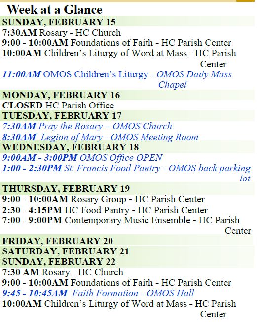 OUR MOTHER OF SORROWS AND HOLY CROSS SCHEDULE FOR THIS UPCOMING WEEK (FEBRUARY 15th TO FEBRUARY 22nd):